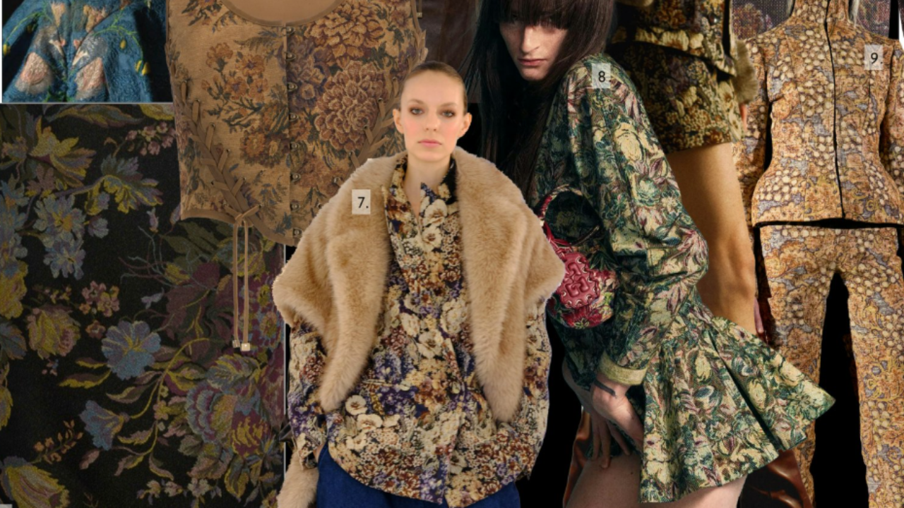 AUTUMN/WINTER 27, Womenswear: Dense botanical prints lifted straight from antique Flemish tapestry — dark-ground florals in muted olive, aged gold, and dusty rose, woven into the collection like heirlooms from a forgotten manor.