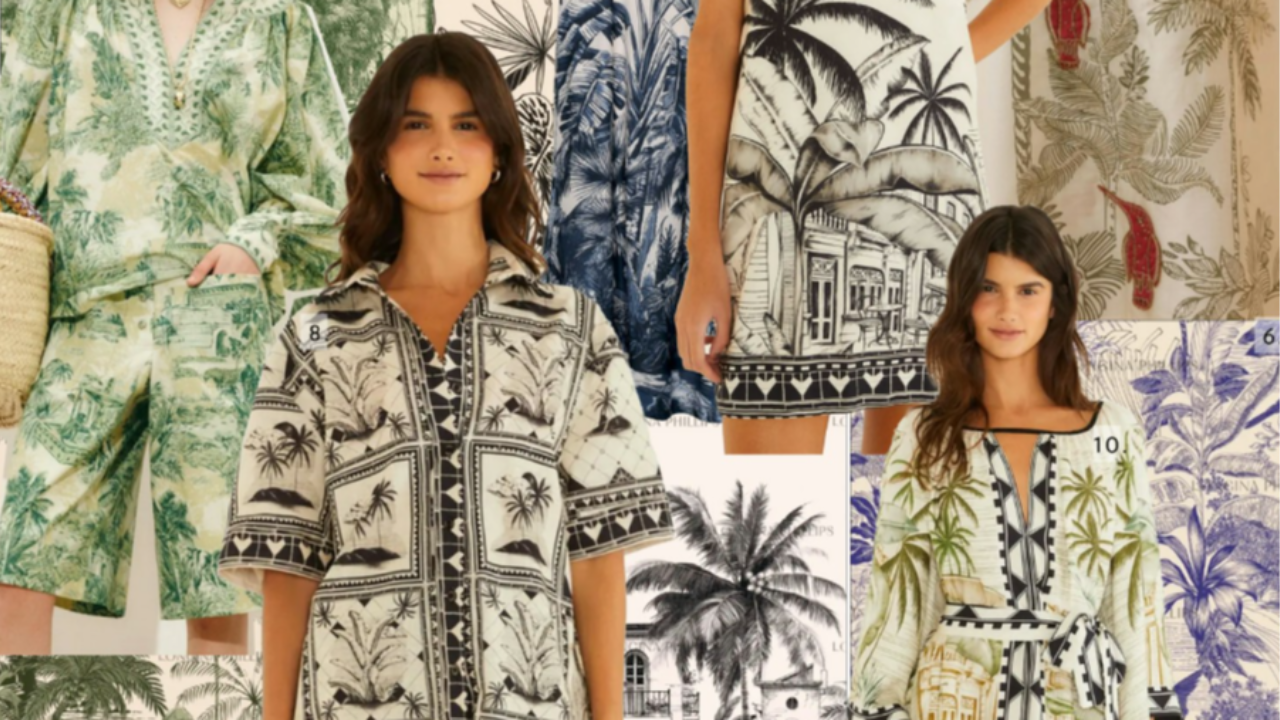 SPRING/SUMMER 27, Womenswear: Illustrated etched style palms and foliage hide Exotic scenes and animals. Borders are key for adding a graphic edge.
